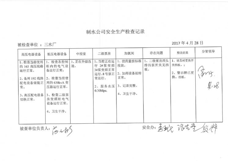 三水廠2017年4月安全生產(chǎn)檢查記錄
