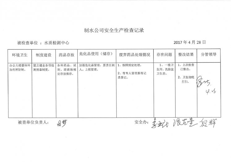 水質(zhì)檢測中心2017年4月安全生產(chǎn)檢查記錄