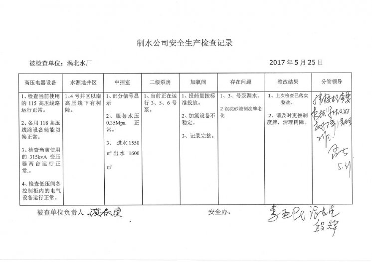 渦北水廠2017年5月安全生產(chǎn)檢查記錄