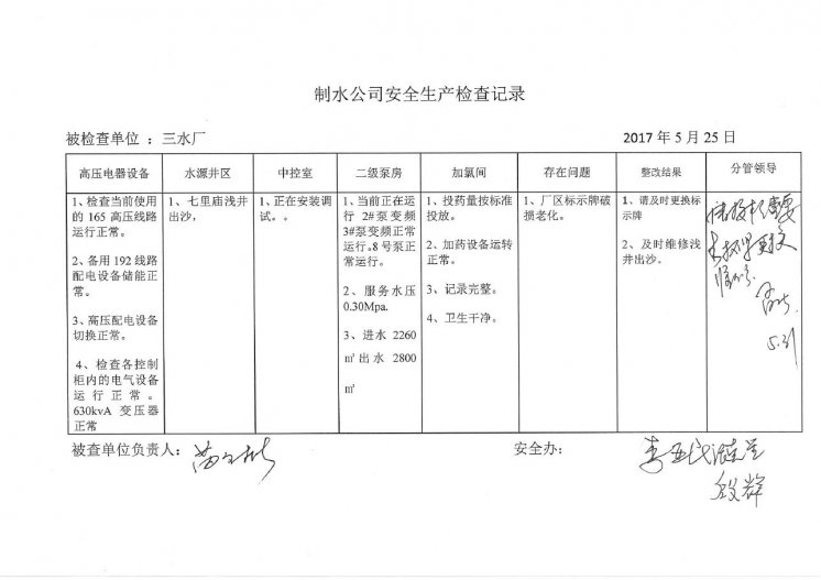 三水廠2017年5月安全生產(chǎn)檢查記錄