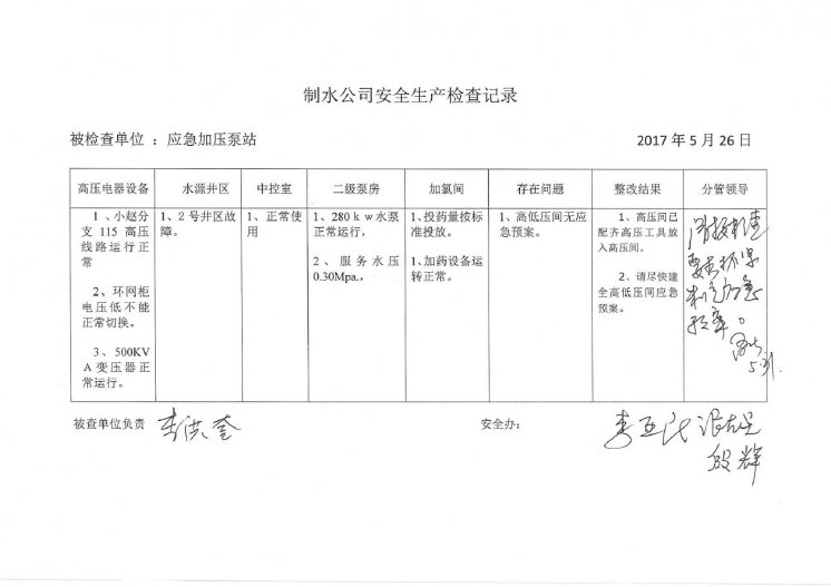 應(yīng)急加壓泵站2017年5月安全生產(chǎn)檢查記錄