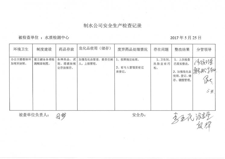 水質(zhì)檢測中心2017年5月安全生產(chǎn)檢查記錄