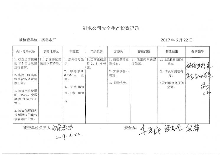渦北水廠2017年6月安全生產(chǎn)檢查記錄