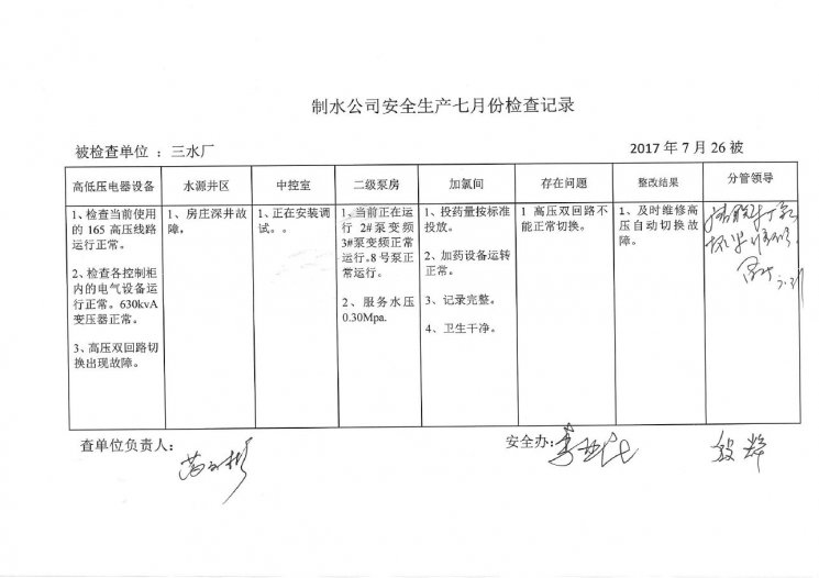 三水廠2017年7月安全生產檢查記錄