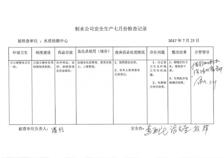 水質檢測中心2017年7月安全生產檢查記錄