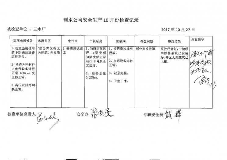 三水廠2017年10月安全生產(chǎn)檢查記錄