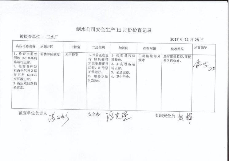 三水廠2017年11月安全生產(chǎn)檢查記錄