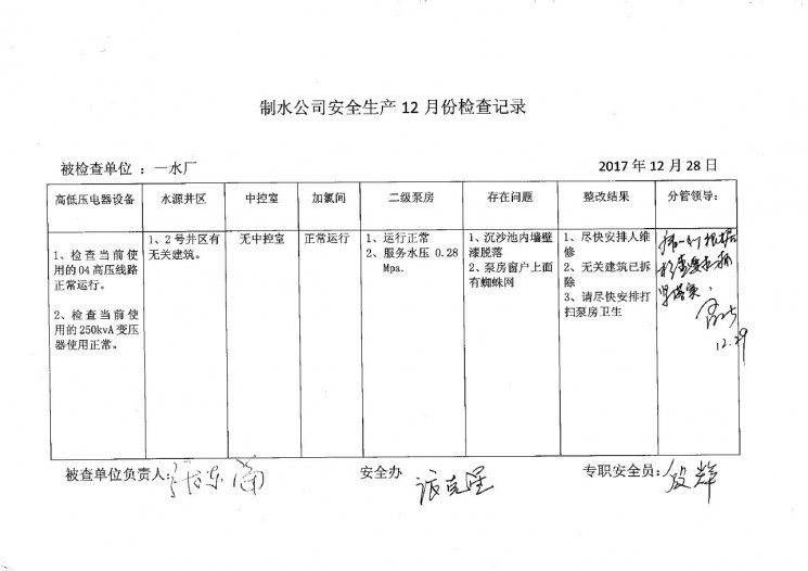 一水廠2017年12月安全生產(chǎn)檢查記錄