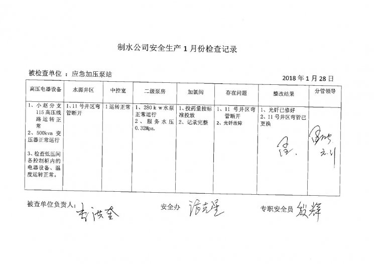 應(yīng)急加壓泵站2018年1月安全生產(chǎn)檢查記錄