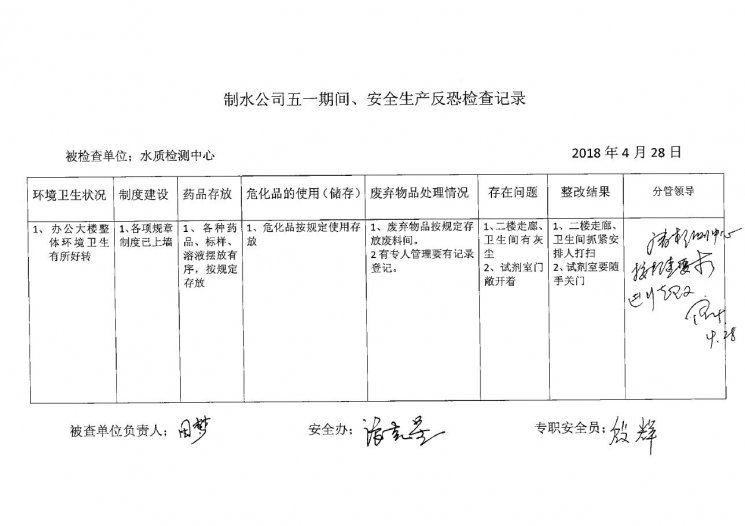 水質(zhì)檢測中心2018年4月安全生產(chǎn)檢查記錄