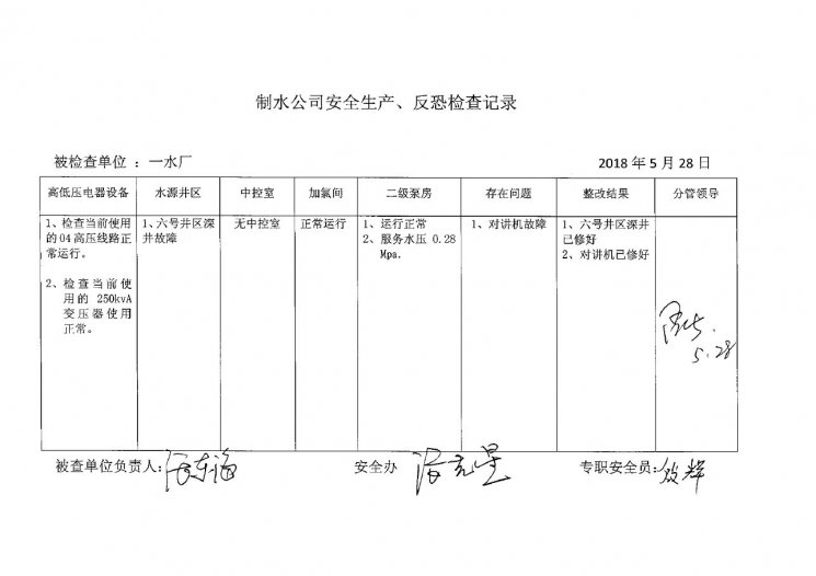 一水廠2018年5月安全生產(chǎn)檢查記錄