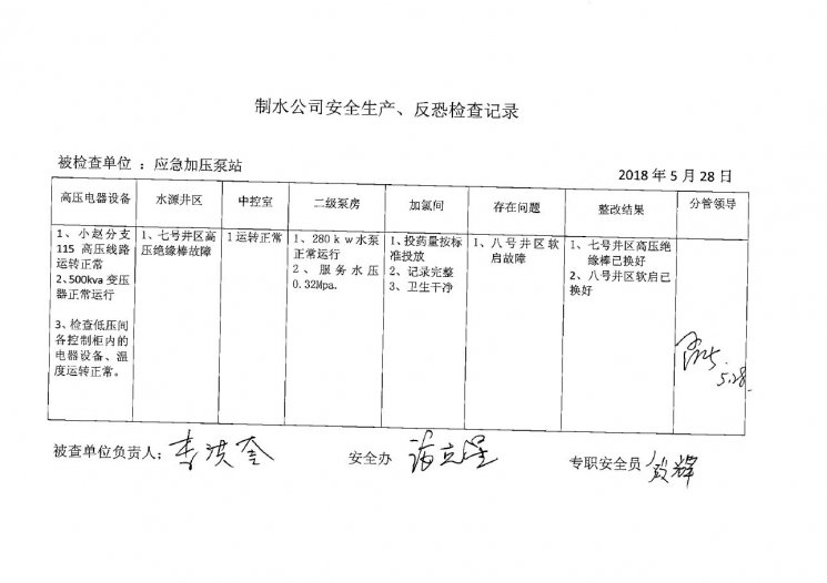 加壓泵站2018年5月安全生產(chǎn)檢查記錄