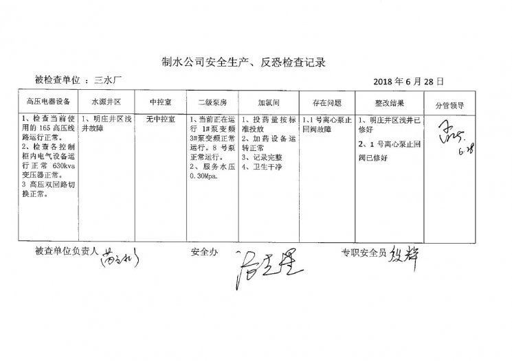 三水廠2018年6月安全生產(chǎn)檢查記錄