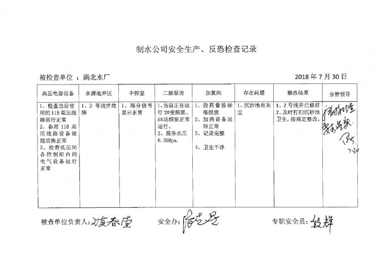 渦北水廠2018年7月安全生產(chǎn)檢查記錄