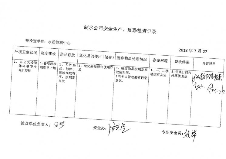 水質(zhì)檢測(cè)中心2018年7月安全生產(chǎn)檢查記錄