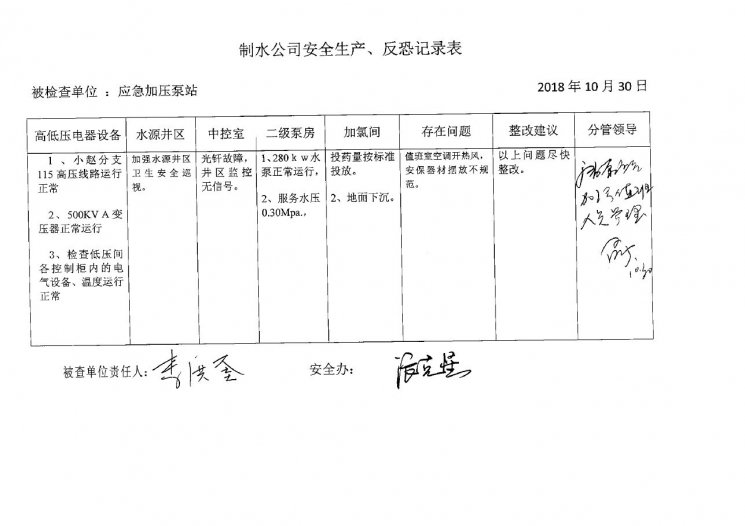 加壓泵站2018年10月安全生產(chǎn)檢查記錄