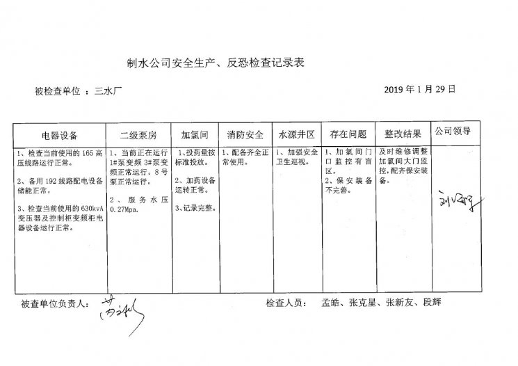 三水廠2019年1月安全生產(chǎn)檢查記錄