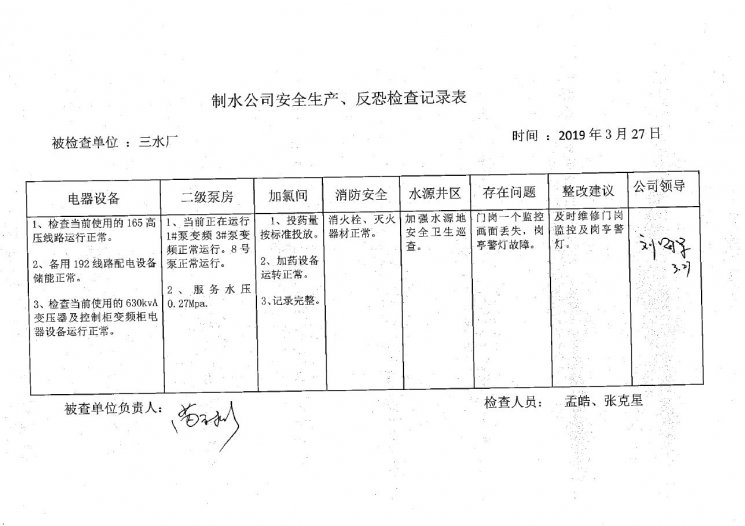 渦北水廠2019年3月安全生產(chǎn)檢查記錄