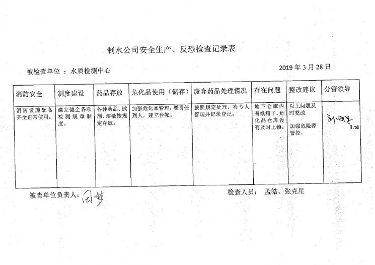 水質(zhì)檢測(cè)中心2019年3月安全生產(chǎn)檢查記錄