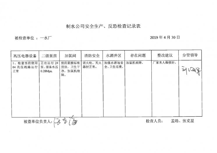 一水廠2019年4月安全生產(chǎn)檢查記錄