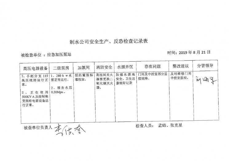 加壓泵站2019年8月安全生產(chǎn)檢查記錄