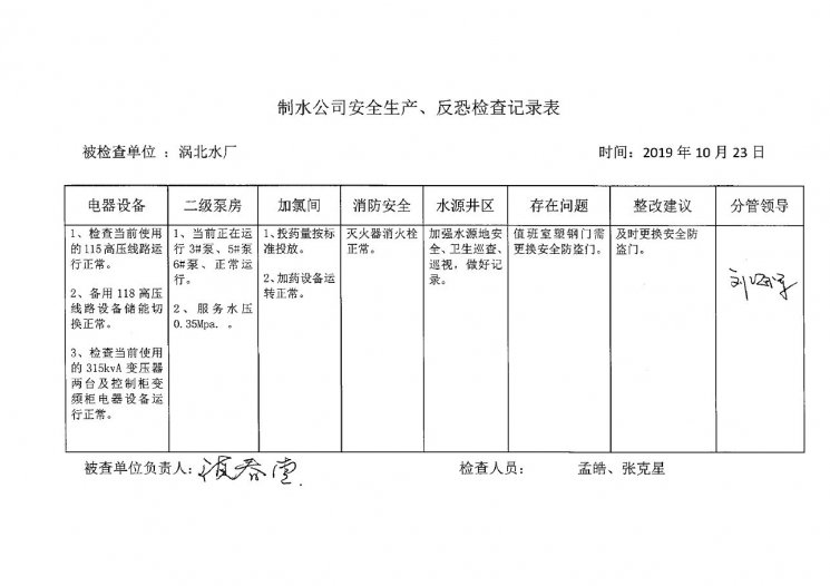 渦北水廠2019年10月安全生產(chǎn)檢查記錄