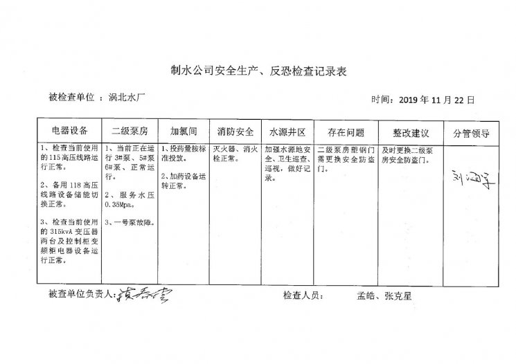 渦北水廠2019年11月安全生產(chǎn)檢查記錄
