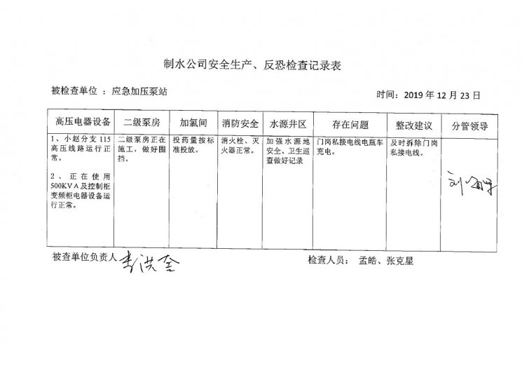 應(yīng)急加壓泵站2019年12月安全生產(chǎn)檢查記錄
