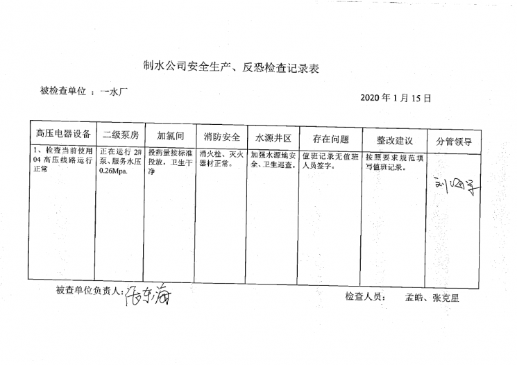 一水廠2020年1月安全生產(chǎn)檢查記錄