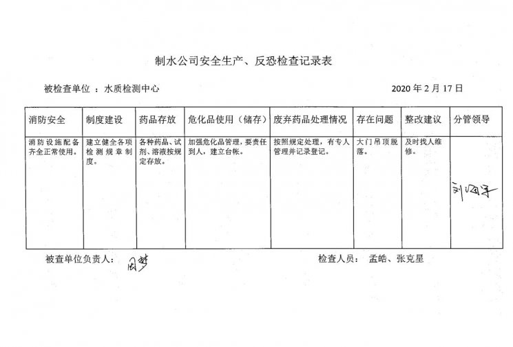水質(zhì)檢測中心2020年2月安全生產(chǎn)檢查記錄