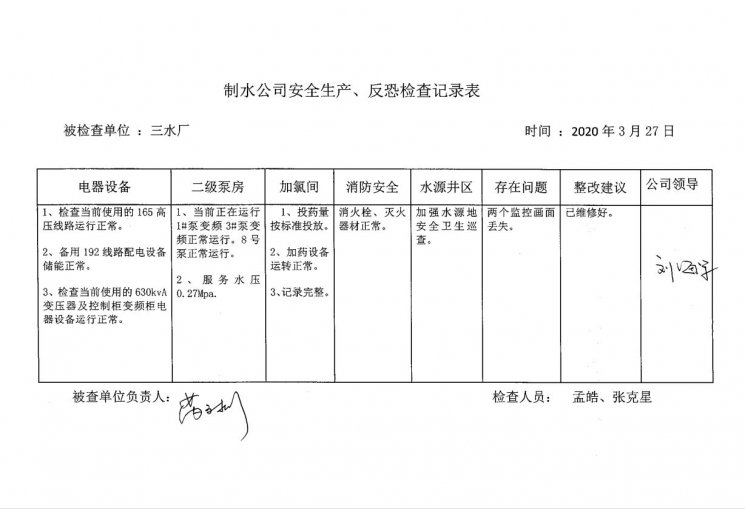 三水廠2020年3月安全生產(chǎn)檢查記錄