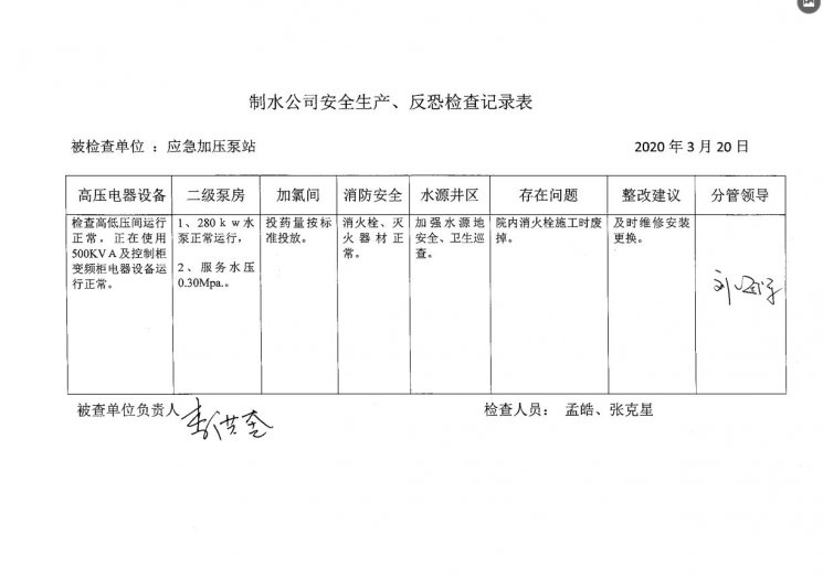 加壓泵站2020年3月安全生產(chǎn)檢查記錄