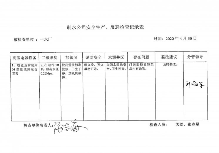 一水廠2020年4月安全生產(chǎn)檢查記錄