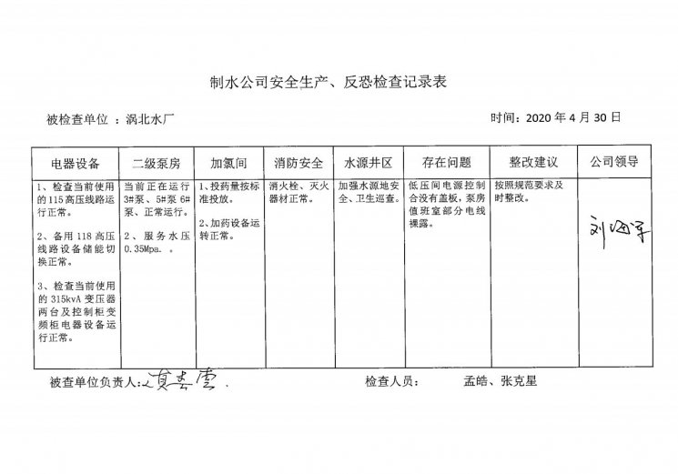 渦北水廠2020年4月安全生產(chǎn)檢查記錄