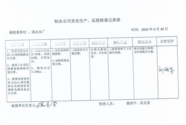 渦北水廠2020年6月安全生產(chǎn)檢查記錄