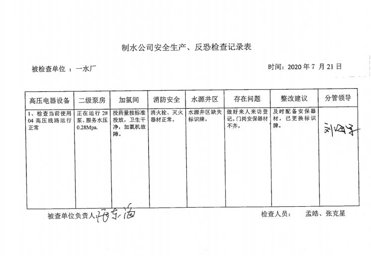 一水廠2020年7月安全生產(chǎn)檢查記錄