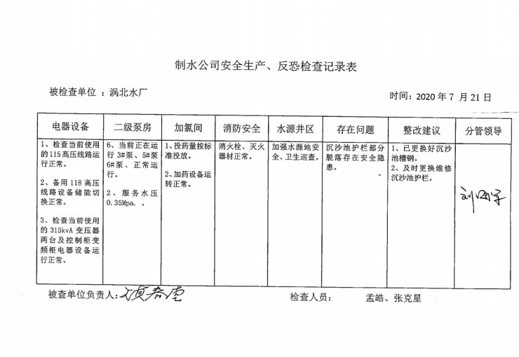 渦北水廠2020年7月安全生產(chǎn)檢查記錄