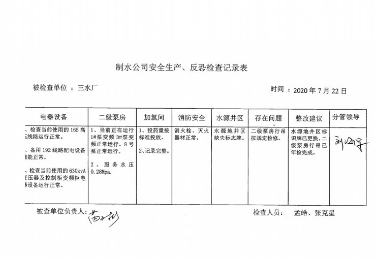三水廠(chǎng)2020年7月安全生產(chǎn)檢查記錄