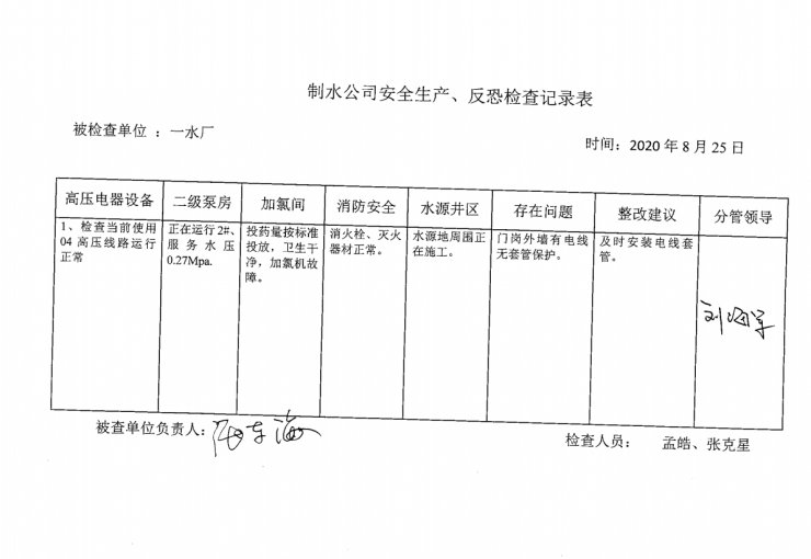 一水廠2020年8月安全生產(chǎn)檢查記錄