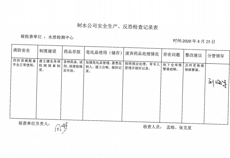 水質(zhì)檢測中心2020年8月安全生產(chǎn)檢查記錄
