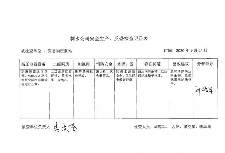 應(yīng)急加壓泵站2020年9月安全生產(chǎn)檢查記錄