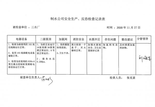 三水廠2020年11月安全生產(chǎn)檢查記錄