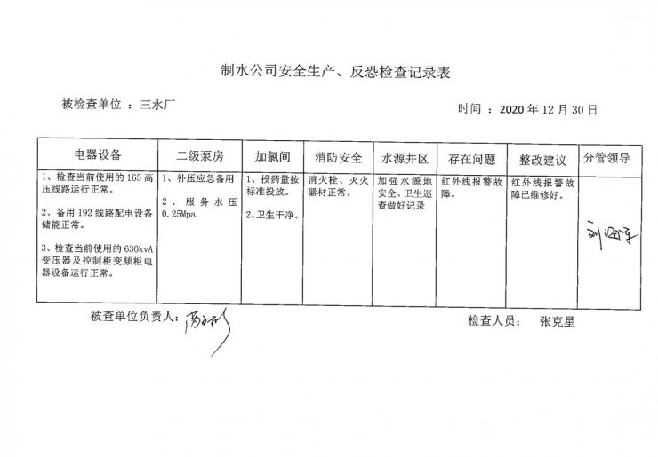 三水廠2020年12月安全生產(chǎn)檢查記錄