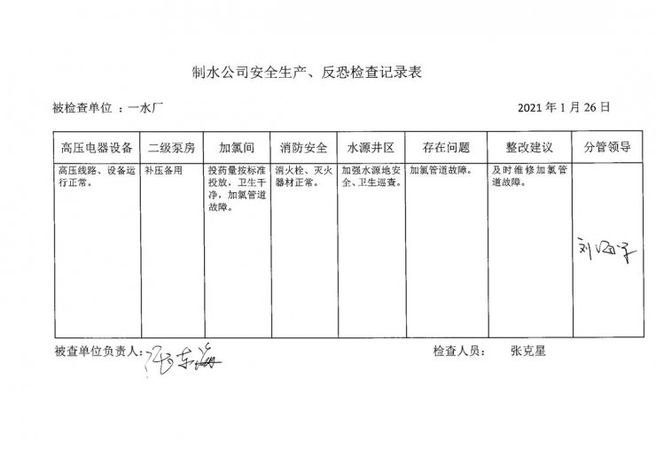 一水廠2021年1月安全生產(chǎn)檢查記錄