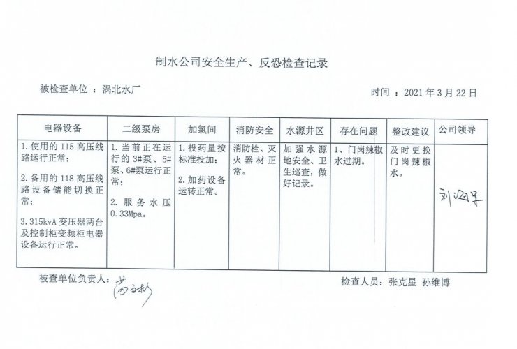 渦北水廠2021年3月安全生產(chǎn)檢查記錄