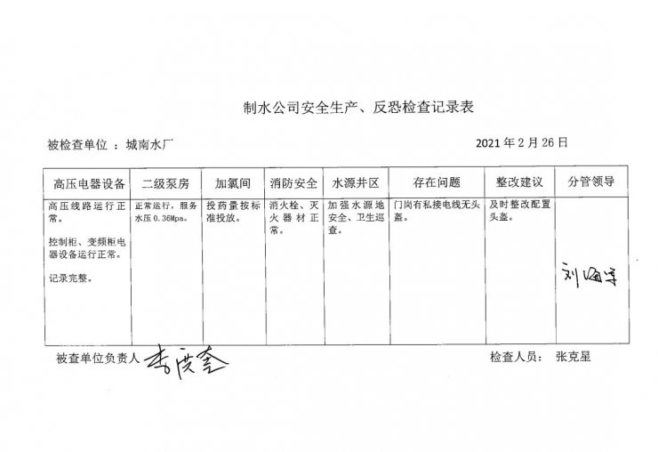 城南水廠2021年2月安全生產(chǎn)檢查記錄
