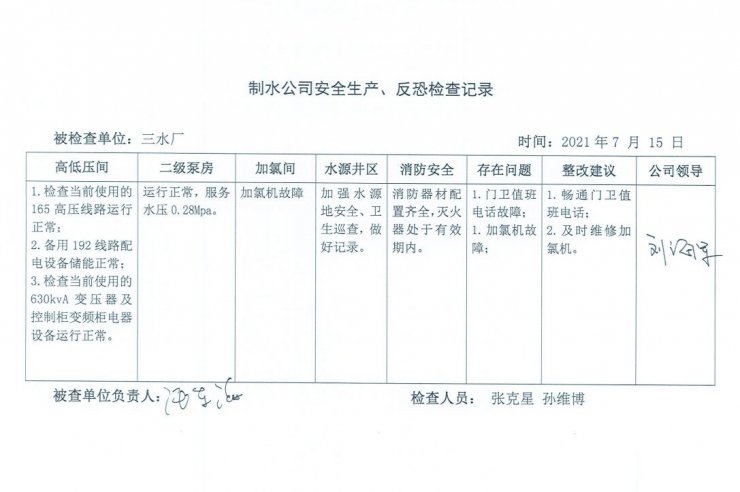 三水廠2021年7月安全生產(chǎn)檢查記錄