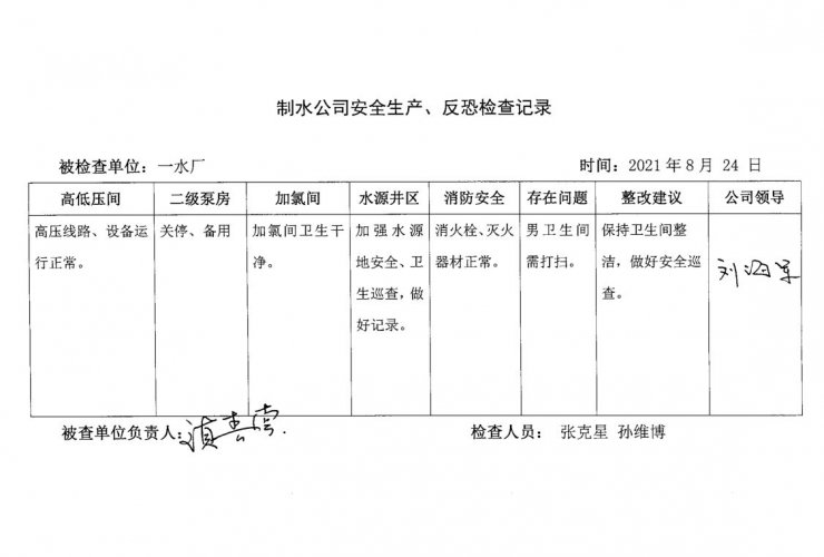 一水廠2021年8月安全生產(chǎn)檢查記錄