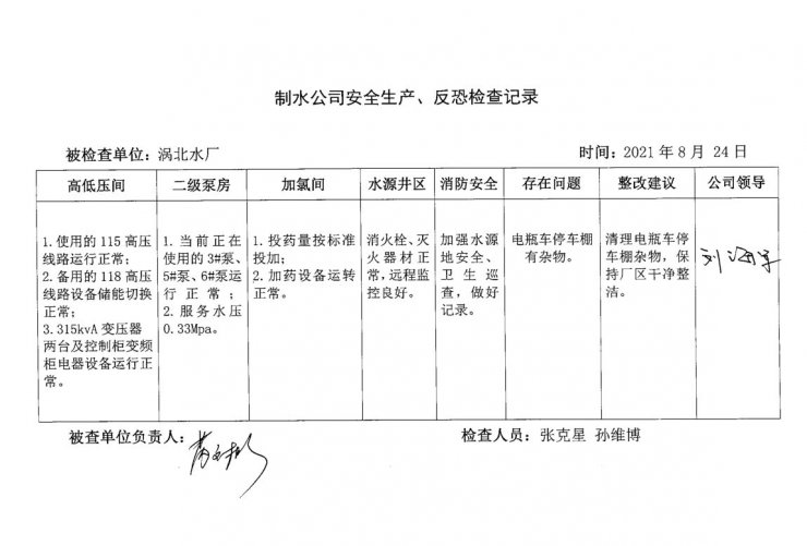 渦北水廠2021年8月安全生產(chǎn)檢查記錄