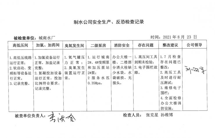 城南水廠2021年8月安全生產(chǎn)檢查記錄